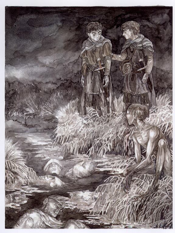 « Tous morts, tous pourris. Elfes, Hommes et Orques. Les Marais Morts. Il y a eu une grande bataille il y a longtemps […] Des grands Hommes avec des longues épées, et des Elfes terribles, et des Orques qui hurlaient. Ils se sont battus sur la plaine pendant des jours et des mois, devant les Portes Noires. Mais les Marais se sont étendus depuis ce temps, ils ont englouti les tombes ; toujours, toujours ils s’étendent. »