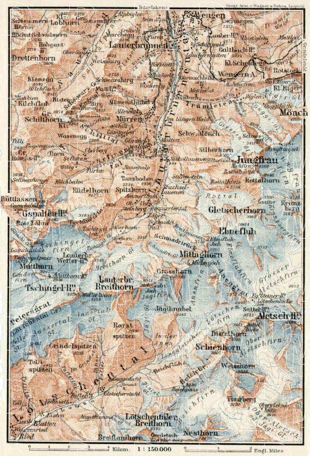 La carte principale « Haute vallée du Lauterbrunnen – Mürren, Grosshorn, Breithorn, Jungfrau » a été publiée en 1909 par Wagner et Debes, à Leipzig. Elle représente la vallée du Lauterbrunnen à l’époque de l’expédition des Brookes-Smith.